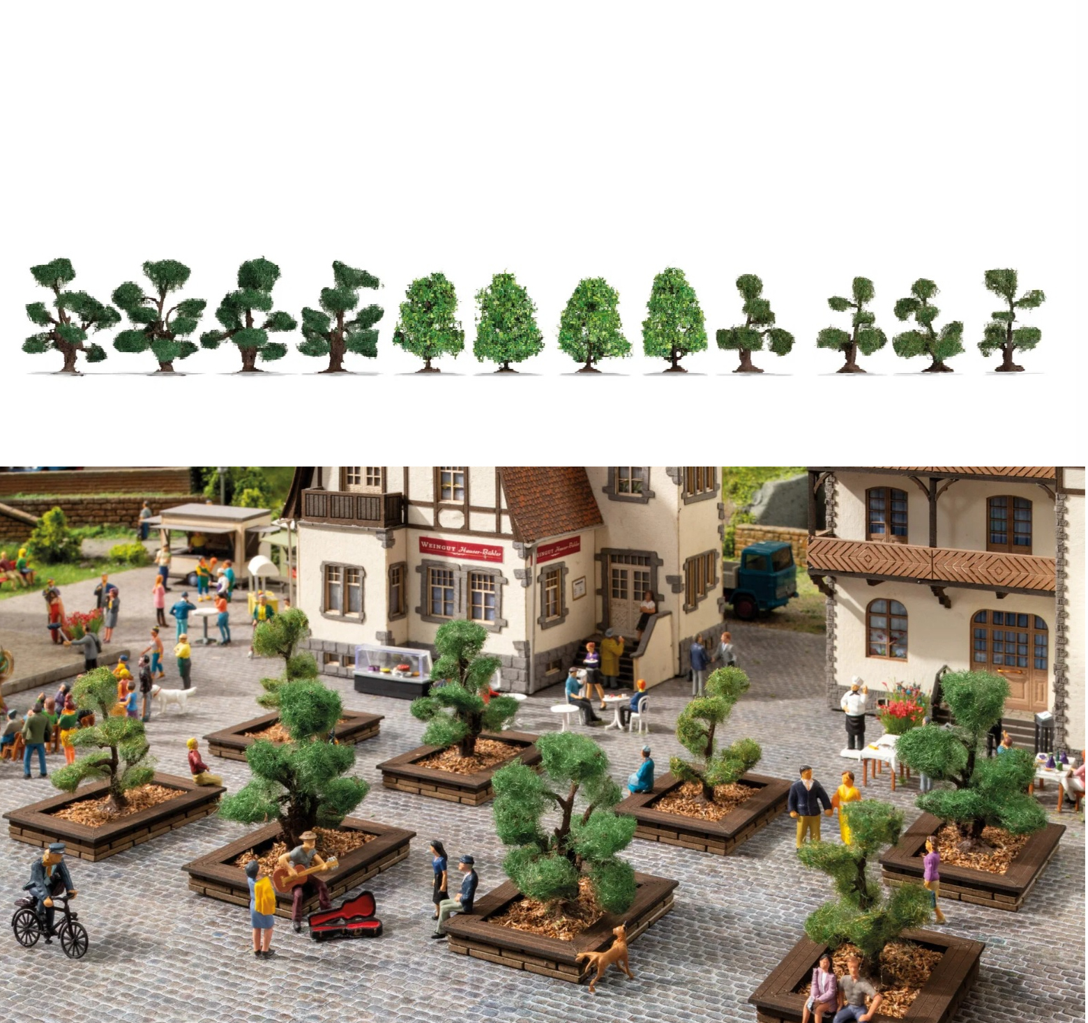התמונה התחתונה היא דוגמה לסידור הנוף בלבד וכל הפריטים פרט לעצים אינם כלולים בערכה.